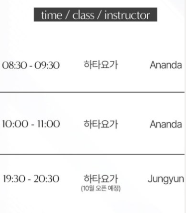 - 연희동 요가 클래스: 하타요가 중심, 하루 3타임, 사전 예약제