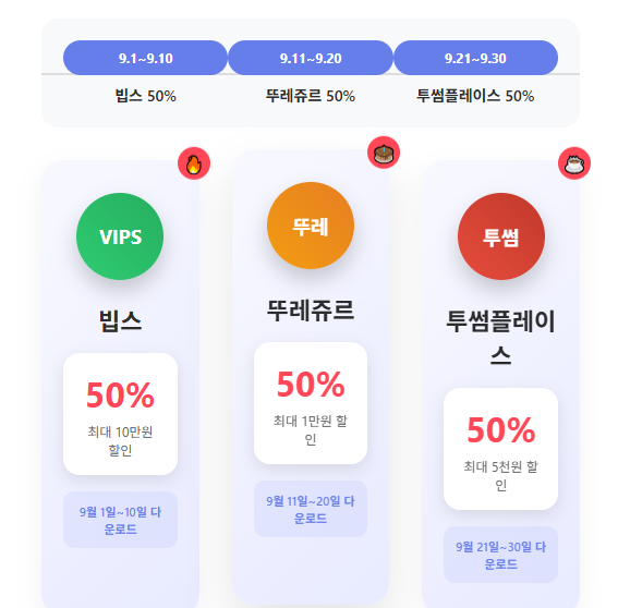 다운로드 기간: 9월 1일(월) ~ 9월 10일(수) 사용 기간: 9월 1일 ~ 10월 31일 (약 2개월) 할인 한도: 최대 10만원까지 할인 가능