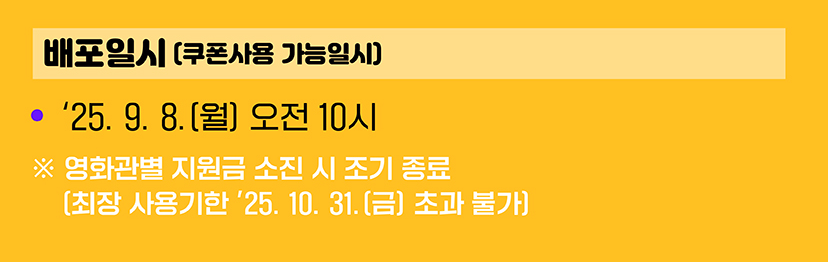 - 지급 방식: 9월 8일(월) 오전 10시부터 각 영화관 앱 또는 웹 쿠폰함에 자동 지급