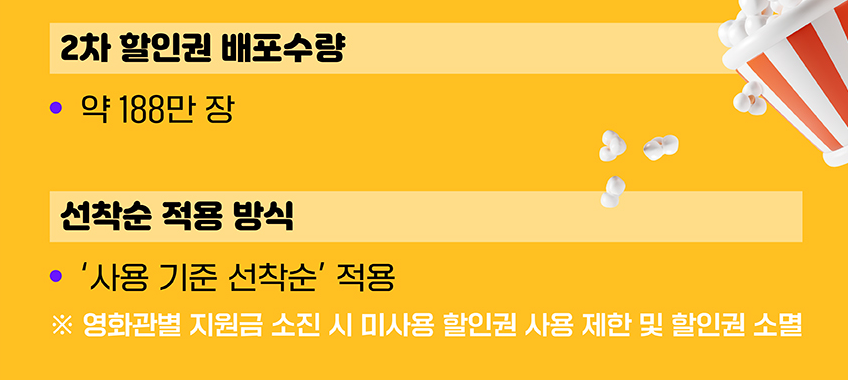이번 2차 쿠폰은 **'선착순 결제 기준'**입니다. 쿠폰을 받더라도 영화관별 예산이 소진되면 사용이 불가능해지므로, 쿠폰을 확인하는 즉시 빠르게 사용하는 것이 가장 좋습니다.