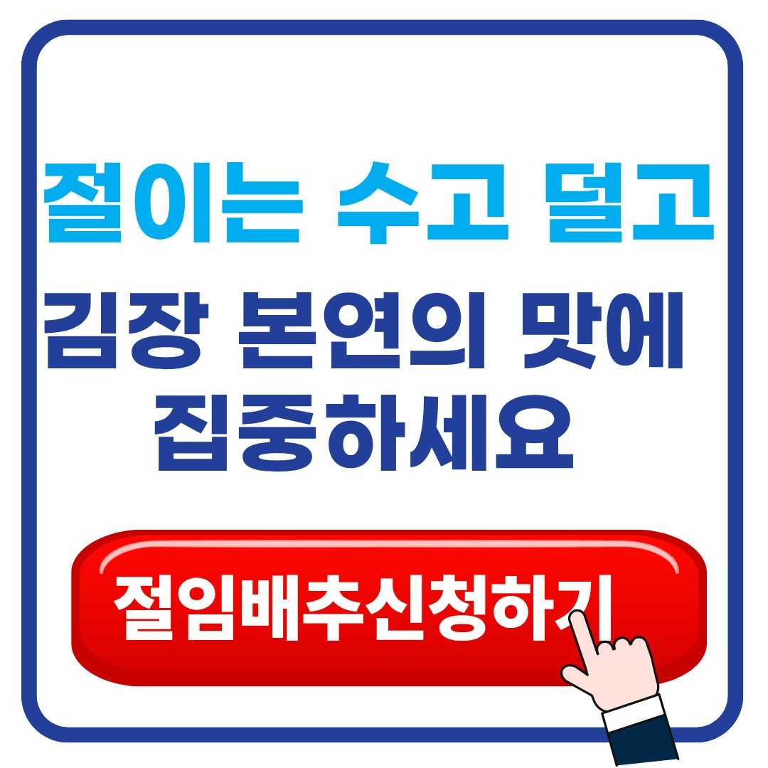 올해는 특히 할인 혜택도 좋고 품질도 우수한 편이라고 합니다. 예약 기간이 짧으니 놓치지 마시고, 지금 바로 예약하셔서 여유롭고 즐거운 김장을 준비해보세요.