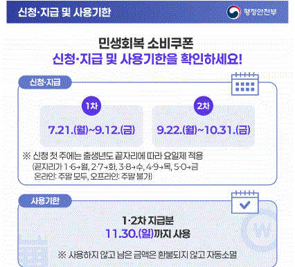 1차 신청: 7월 21일 ~ 9월 12일 오후 6시 2차 추가: 9월 22일 ~ 10월 31일 사용 마감: 11월 30일 (이후 소멸!)