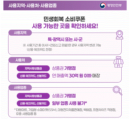 사용 가능: 전통시장, 동네 마트, 음식점, 미용실, 병원, 학원 등 연매출 30억 원 이하 소상공인 매장
