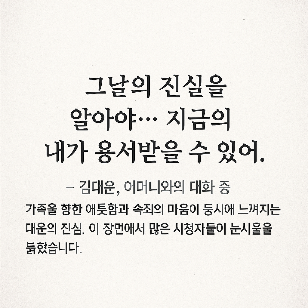 가족을 향한 애틋함과 속죄의 마음이 동시에 느껴지는 대운의 진심. 이 장면에서 많은 시청자들이 눈시울을 붉혔습니다.